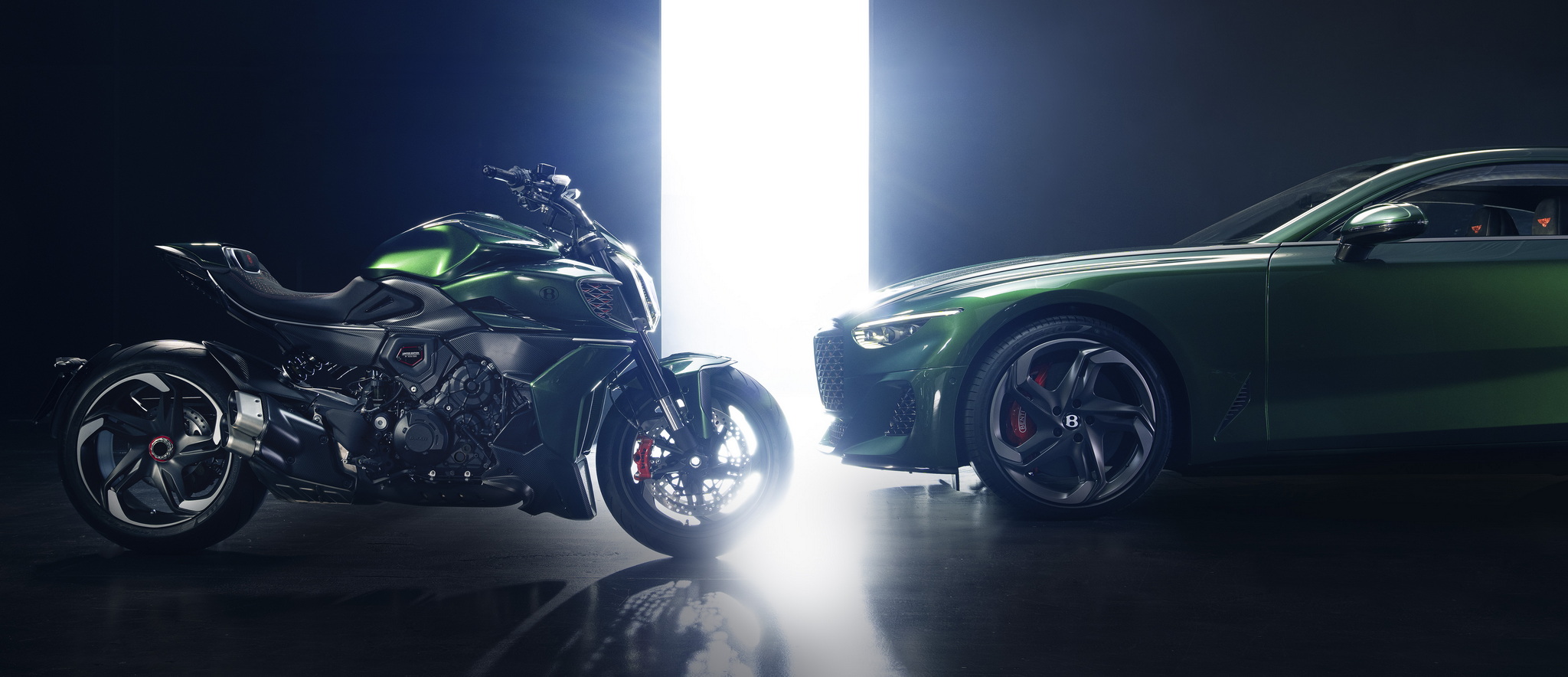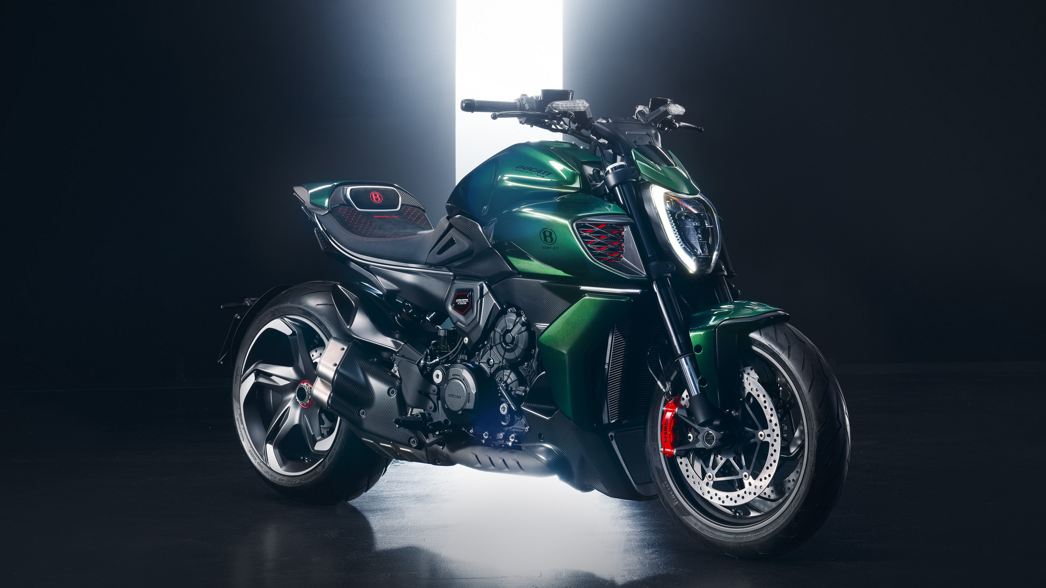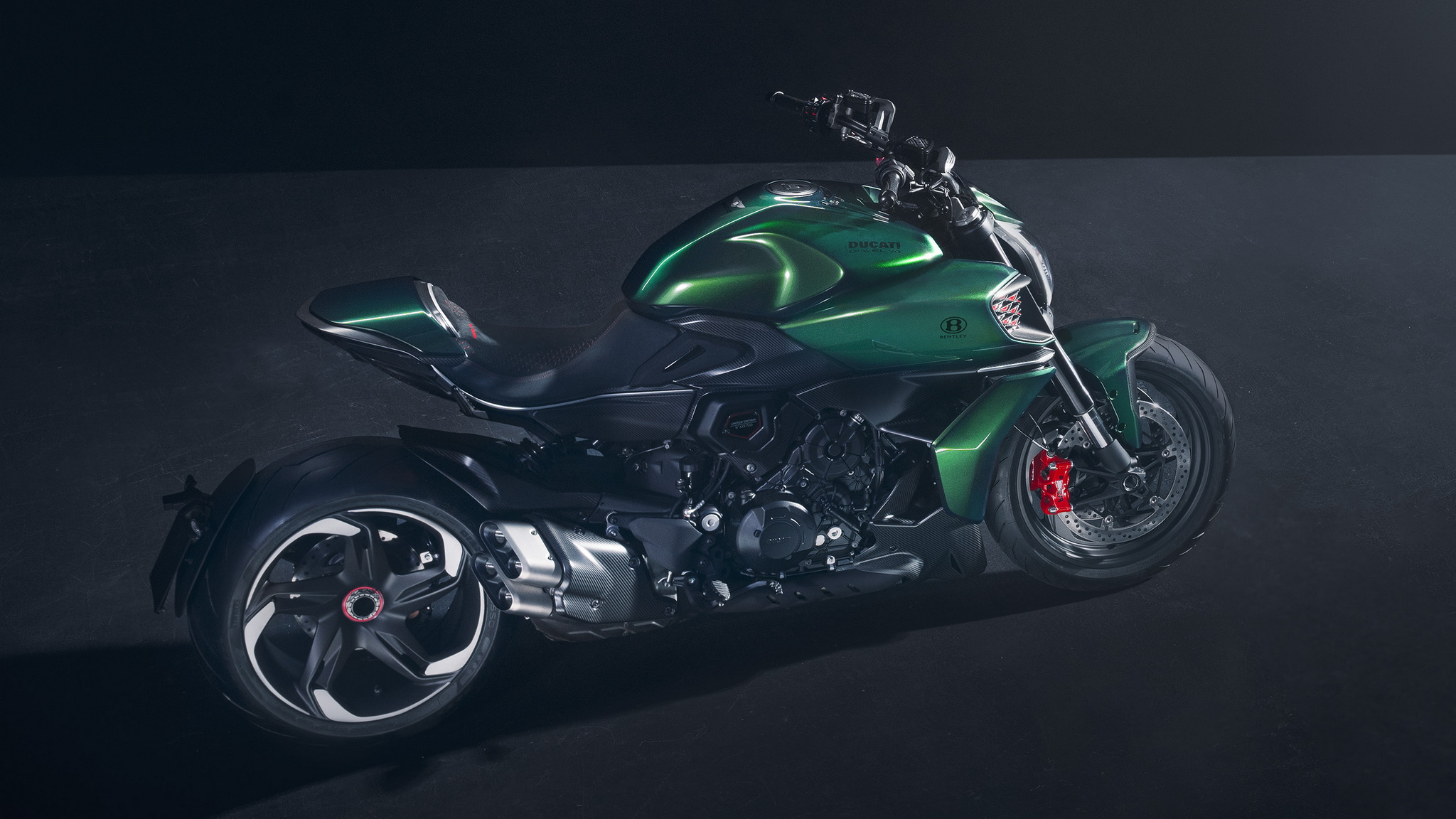 Diavel สำหรับ Bentley สร้างพิเศษบนพื้นฐาน Diavel V4 ตัวล่าสุด ซึ่งมันจะถูกเผยตัวครั้งแรกต่อสาธารณชนที่งาน Art Basel 2023 ในไมอามี ตัวรถจะมาในสีเขียวเมทัลลิก Scarab Green ที่ดูหรูหราเฉดเดียวกับของ Bentley Mulliner ชิ้นส่วนอื่นโดยรอบจะเน้นเป็นงานคาร์บอนไฟเบอร์ แผงช่องลมหน้ารถดีไซน์เหมือนกระจังหน้า Batur เบาะนั่งหุ้มด้วย Alcantara สีดำเจาะรูเป็นลวดลายเผยให้เห็นผ้าหุ้มสีแดงอีกชั้นและปักโลโก้ Bentley ขนาดใหญ่ ล้อฟอร์จเป็นสี Dark Titanium ลายพิเศษเหมือนกับ Batur และคาลิปเปอร์เบรกสีแดงจาก Brembo สำหรับเครื่องยนต์ยังเหมือนดั้งเดิม V4 Granturismo ขนาด 1,158 ซีซี 168 แรงม้า