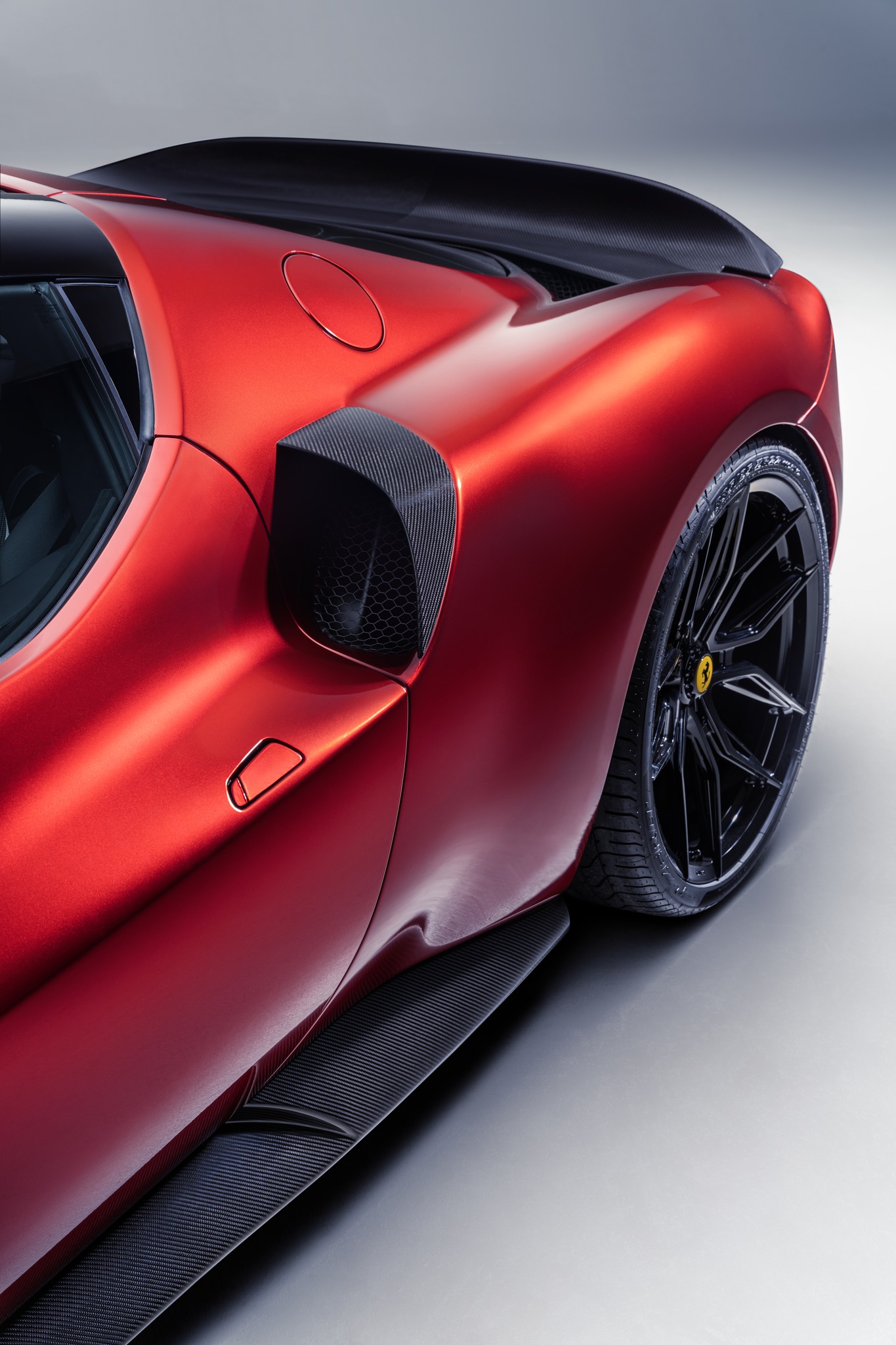 Novitec Ferrari 296 GTB ภายนอกยกระดับความหล่อด้วยชุดแต่งผลิตจากคาร์บอนไฟเบอร์ทั้งหมด เช่น ลิ้นสปอยเลอร์หน้า, สเกิร์ตข้าง, ฝาครอบกระจกมองข้าง, ช่องอากาศข้างตัวรถ, แผงฝาครอบเครื่องยนต์, ดิฟฟิวเซอร์ท้าย และปีกท้ายแบบตูดเป็ด มีล้อฟอร์จจาก Vossen ขนาดด้านหน้า 20 นิ้ว หลัง 21 เลือกสีได้ตามใจ ช่วงล่างมีให้อัพเกรดเฉพาะสปริงอย่างเดียวหรือพร้อมโช้คอัพด้วย สามารถเพิ่มไฮดรอลิคยกหน้ารถเพื่อความสะดวกสบายได้