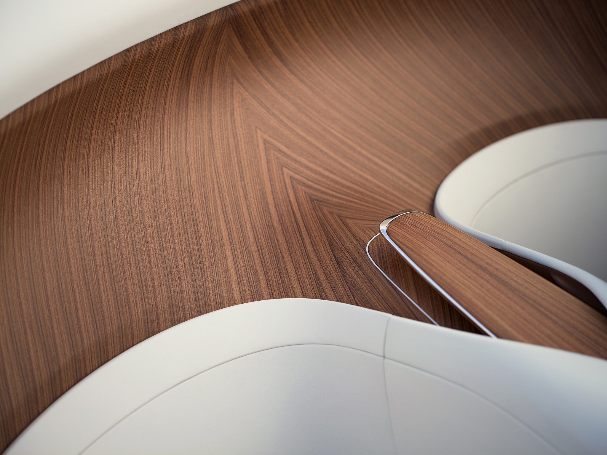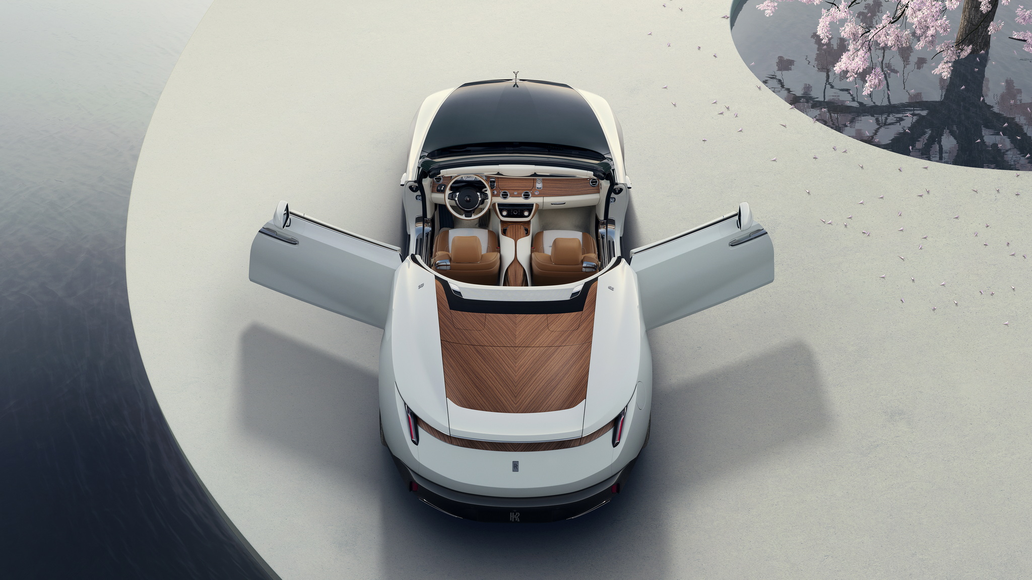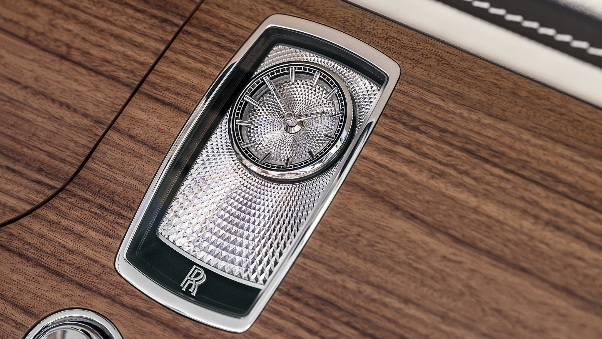 ห้องโดยสารมอบบรรยากาศที่สงบดุจที่พักส่วนตัว ด้วยหนังสีทูโทนสั่งพิเศษที่ลูกค้าขอสงวนชื่อสีไว้ เป็นหนังสีขาวตัดสีน้ำตาล กลมกลืนไปกับแผงไม้วีเนียร์ Santos Straight Grain ที่ถูกต่อลายอย่างสวยงาม ช่างฝีมือของโรลส์-รอยซ์ต้องใช้ชิ้นไม้ถึง 233 ชิ้น ทั่วห้องโดยสาร โดยมี 76 ชิ้น ที่นำไปใช้กับส่วนท้ายรถ ตัวไม้ทนทานต่อสภาพอากาศด้วยการเคลือบผิวแบบที่ใช้กันบนซูเปอร์ยอชต์ นาฬิกาที่ฝังอยู่บนคอนโซลหน้าก็ทำพิเศษ ตัวหน้าปัดเป็นลายแพทเทิร์น Guilloché (กิโยเช่) ทรงเลขาคณิตเล็กๆ เรียงต่อกัน ซึ่งถ้ามานับดูจะได้ทั้งหมด 119 เหลี่ยม ถือเป็นการยกย่องต่อแบรนด์โรลส์-รอยซ์ที่เพิ่งฉลองครบรอบ 119 ปี ไปเมื่อปี 2023