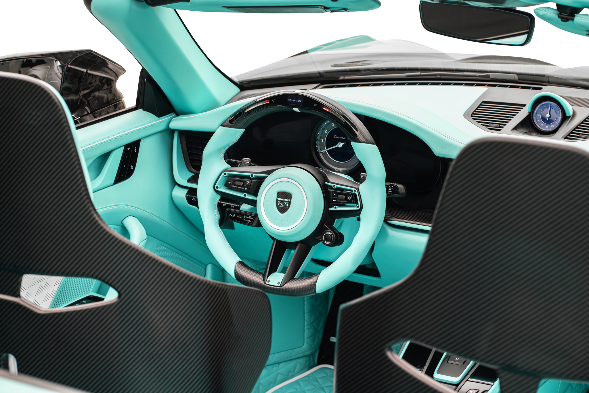ห้องโดยสารก็ทำใหม่จัดเต็มด้วยวัสดุหนังแท้ พวงมาลัยหุ้มหนังสลับคาร์บอนไฟเบอร์พร้อมไฟเปลี่ยนเกียร์ เบาะนั่งแบบสปอร์ตคาร์บอนไฟเบอร์ช่วยรีดน้ำหนัก โทนสีรายละเอียดต่างๆ เป็นได้ตามสั่งลูกค้า