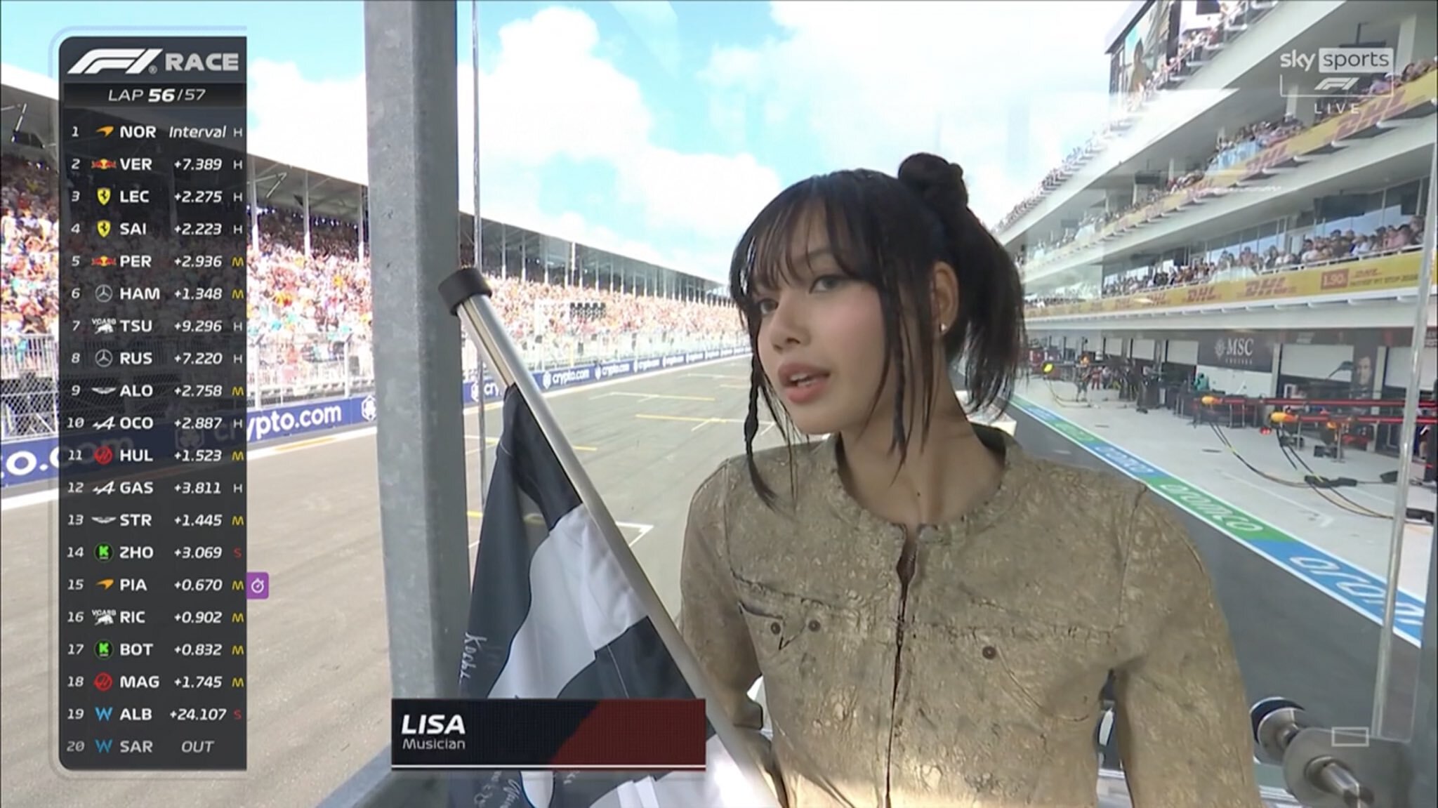 ไม่เพียงแค่ผู้ชมทางบ้าน กระแสในสนามก็ไม่แพ้กัน เพราะลิซ่า BLACKPINK ได้รับเกียรติให้เป็นผู้โบกธงหมากรุก ซึ่งผู้ที่จะได้สิทธิพิเศษแบบนี้ล้วนเป็นบุคคลระดับโลกทั้งนั้น ไม่ว่าจะ เซเรนา วิลเลียมส์, เดวิด เบ็คแฮม, เปเล่, ทอม ฮอลแลนด์, จัสติน บีเบอร์, วิล สมิธ, โคลอี เกรซ มอเรตซ์ โดยลิซ่าได้โพสต์ภาพผ่าน IG พร้อมเขียนความรู้สึกว่า “เป็นเกียรติที่ได้โบกธงครั้งแรกของฉันที่ F1 และยังถ่ายภาพคู่กับ Max Verstappen แชมป์โลก 3 สมัยจากทีม Red Bull Racing ซึ่งจบเป็นที่สองในสนามนี้ สำหรับผู้ที่คว้าชัยสนามนี้ไปคือ Lando Norris รถหมายเลข 4 จากทีม McLaren นี่ถือเป็นชัยชนะแรกของเขาใน F1