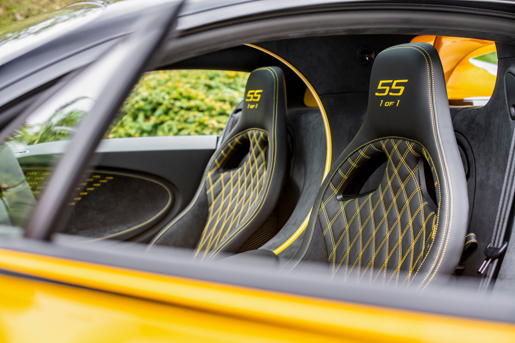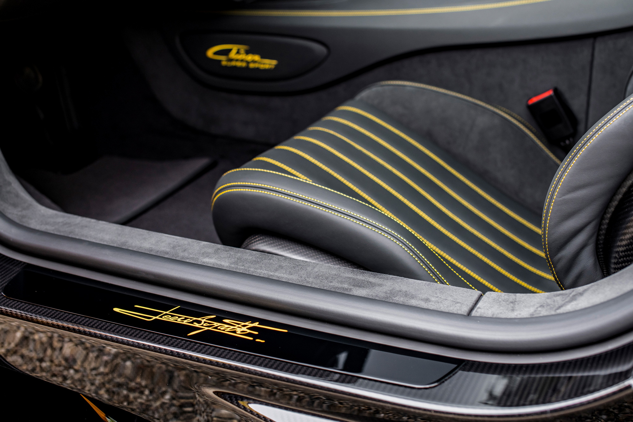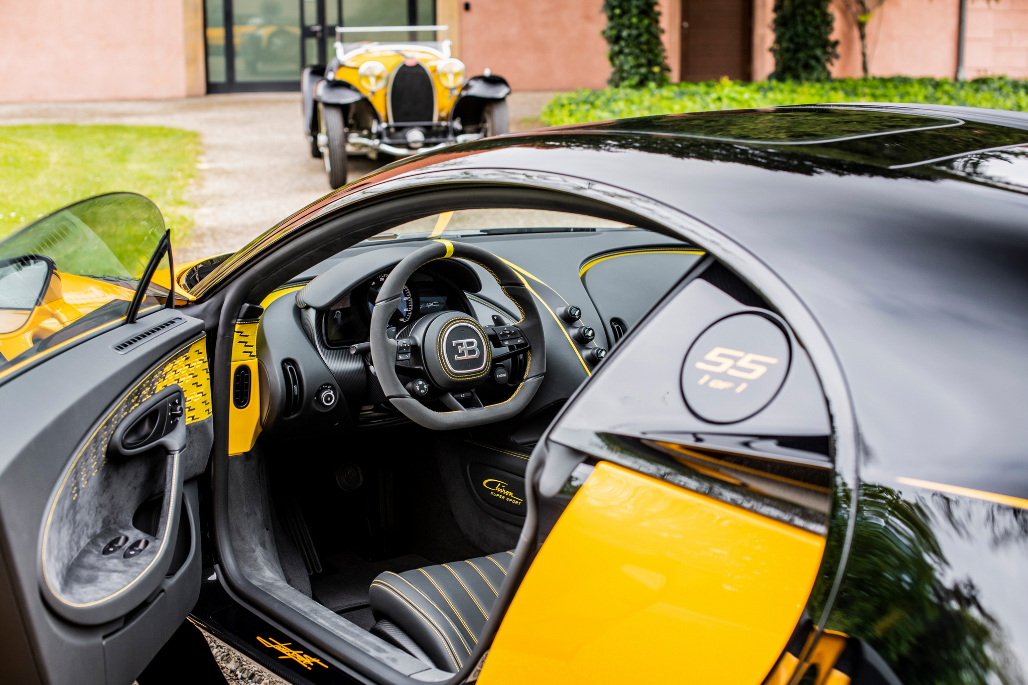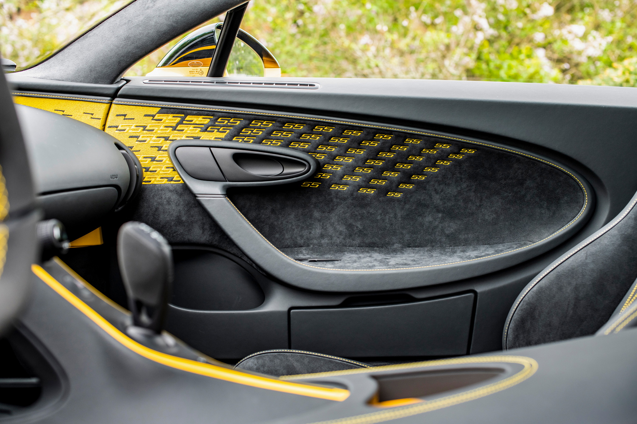 ห้องโดยสารเน้นโทนเดียวกับด้านนอกด้วยสีเหลืองตัดดำ ตัวเลข 55 สีเหลืองจำนวนมากถูกปักบนแผงข้างประตู 2 ฝั่ง พนักพิงศีรษะปักแสดงข้อความ '55 1 of 1' และที่กาบบันไดยังได้ลายเซ็นของ Jean Bugatti ตอกย้ำถึงความพิเศษ