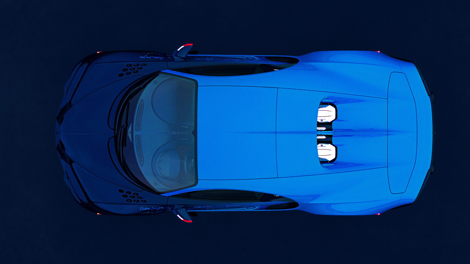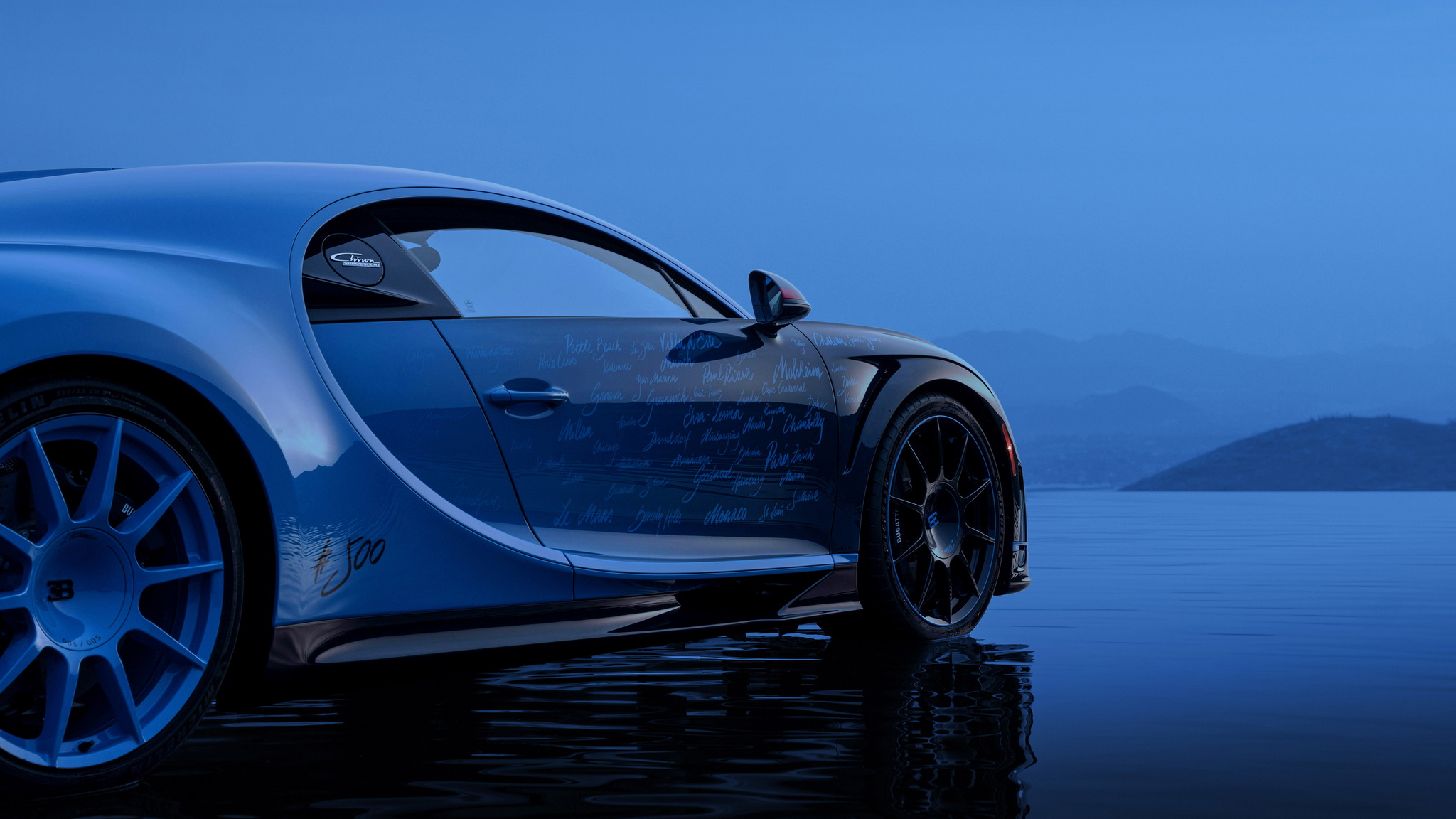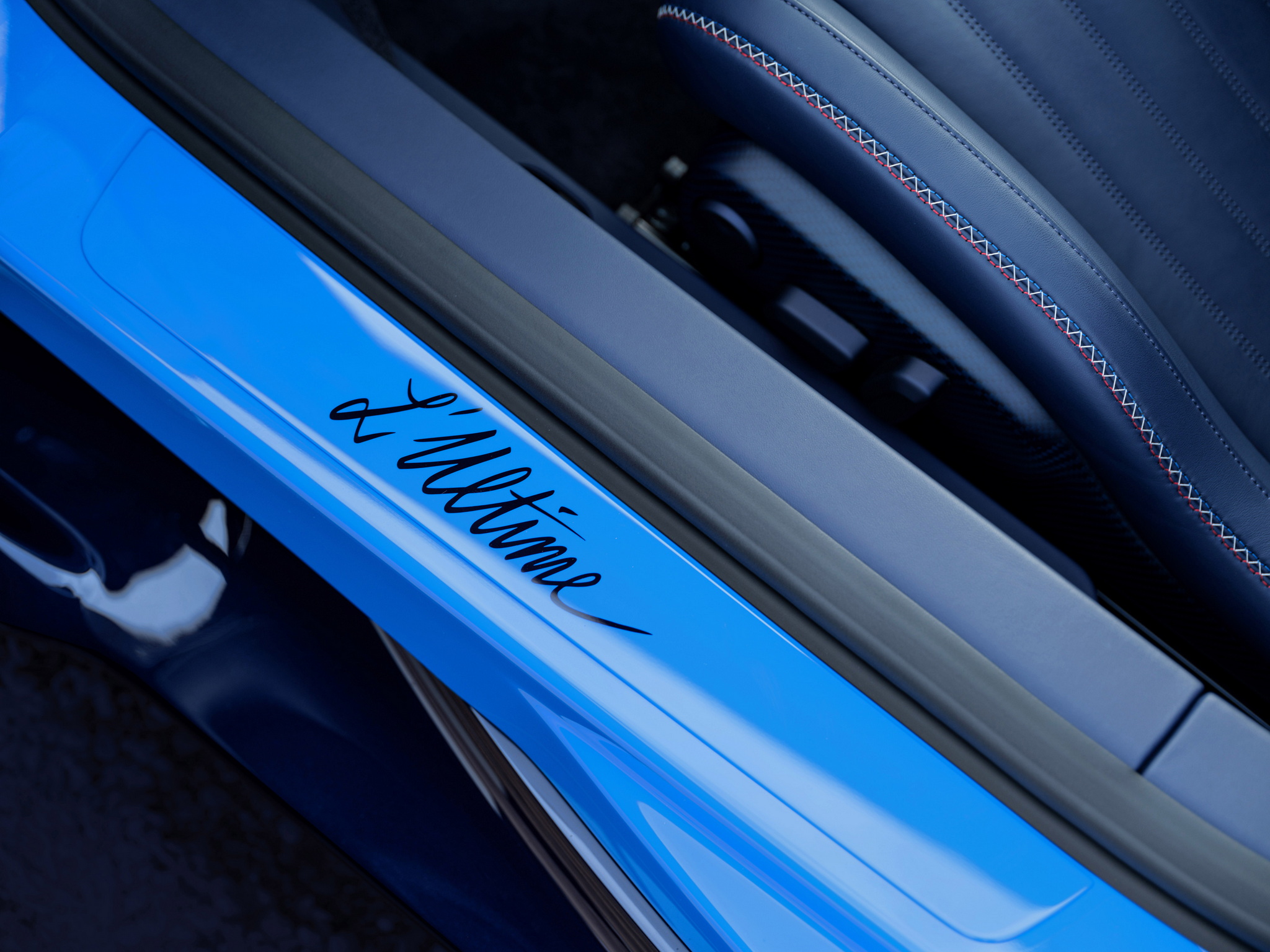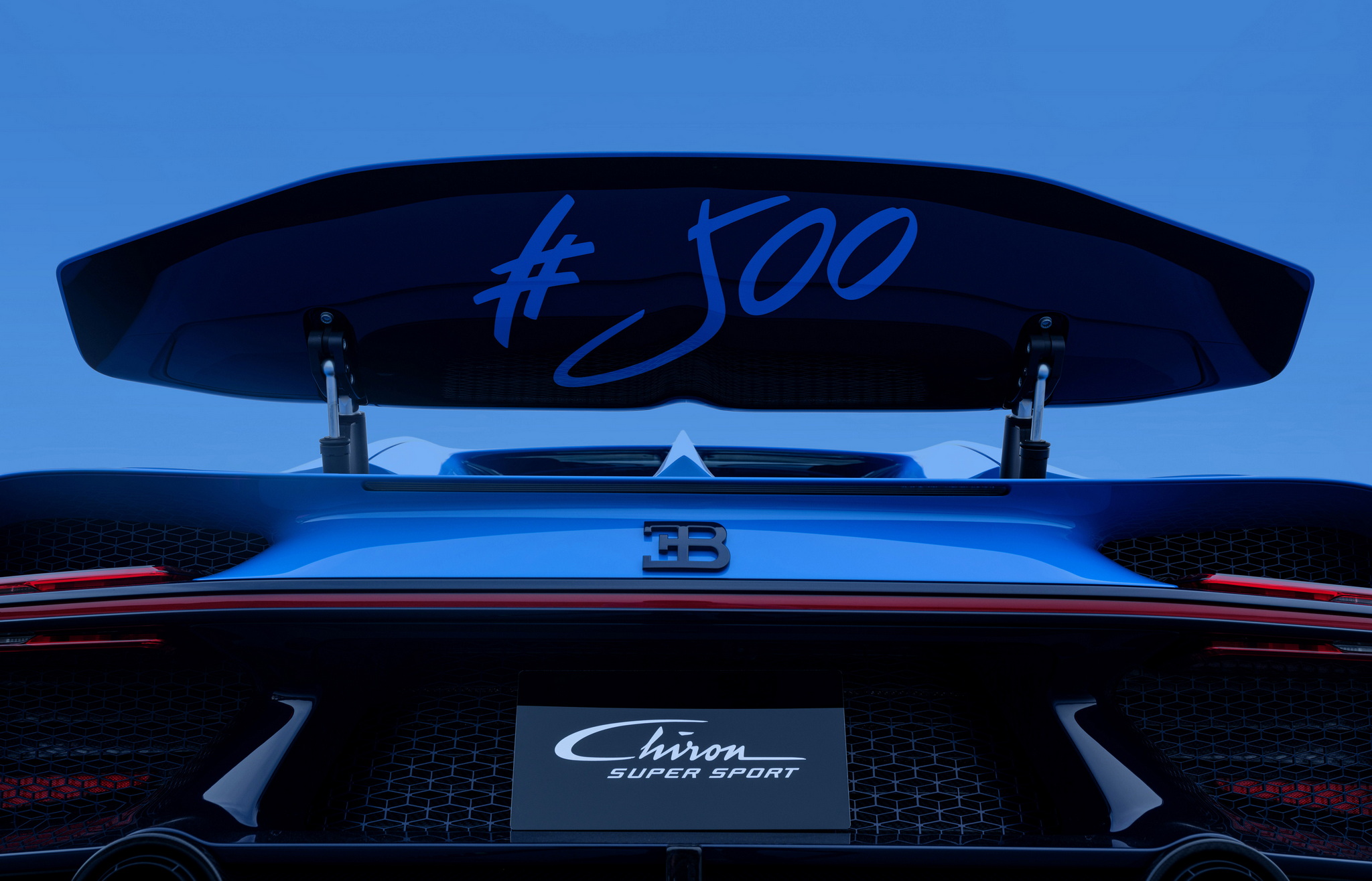 Bugatti Chiron Super Sport L'Ultime รถคันที่ 500 สร้างมาสะท้อนให้เห็นถึง Chiron ที่เปิดตัวครั้งแรกในปี 2016 ด้วยตัวถังสีฟ้า French Racing Blue และ Atlantic Blue ที่ทำแบบไล่เฉดได้อย่างหรูหรา กระจังหน้าทรงเกือกม้าดีไซน์ตะแกรงแบบพิเศษ กระจกมองข้างประดับธงชาติฝรั่งเศสบ่งบอกต้นกำเนิด ด้านข้างตัวรถมีอักษรมากมายถูกสร้างด้วยมือ เป็นการบันทึกชื่อของสถานที่และงานสำคัญต่างที่ Chiron ได้ผ่านมา ตัวเลข #500 ยังปรากฏที่ส่วนล่างตัวถังข้างรถ, ล้อทั้ง 4, ฝาครอบเครื่องยนต์ และที่ใต้ปีกท้ายแบบแอ๊คทีฟ