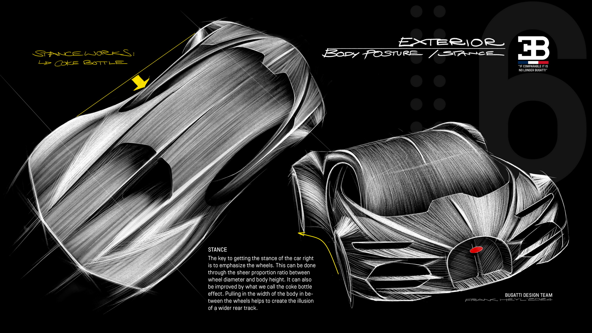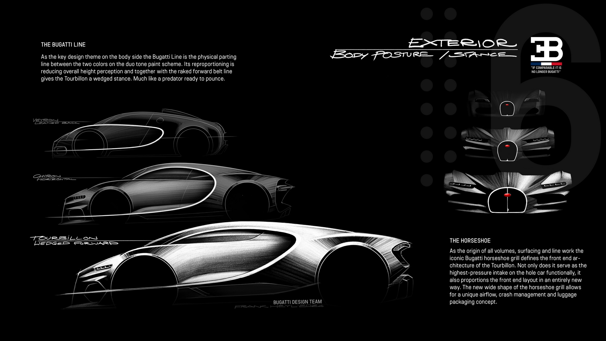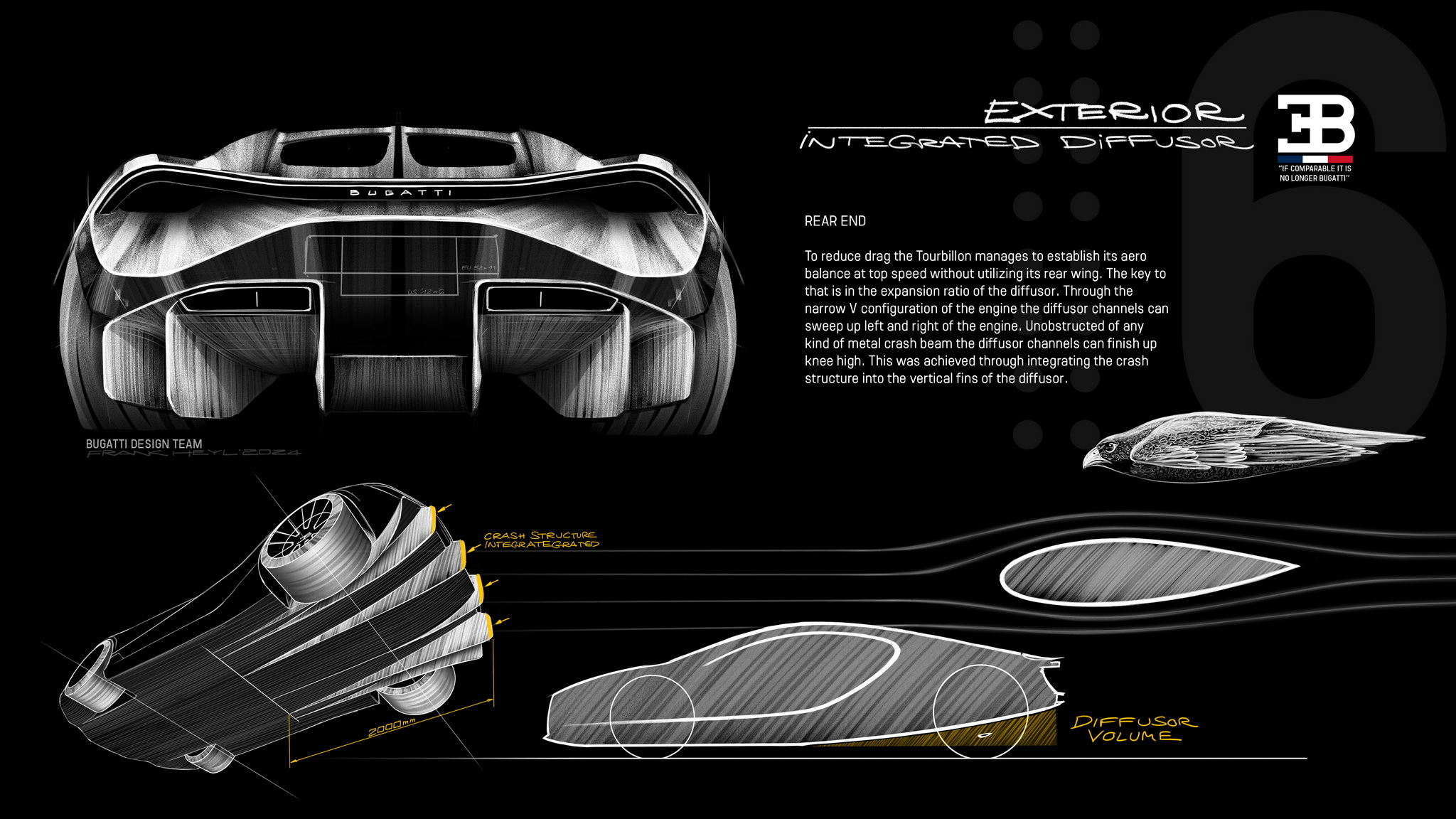 Bugatti Tourbillon มากับดีไซน์ภายนอกใหม่หมดมีความดุดันและล้ำกว่า Chiron ขึ้นไปอีก ครั้งแรกกับประตูยกแบบปีกผีเสื้อทำงานด้วยไฟฟ้า กระจังหน้าเกือกม้ากว้างขึ้น มีเส้นคาดกลางลำตัวรถแบบ Type 57SC Atlantic เส้น C-line ข้างตัวรถโฉบเฉี่ยวขึ้น บั้นท้ายมากับดิฟฟิวเซอร์ที่ใหญ่และสูงมากทำงานร่วมกับปีกหลังแบบแอ๊คทีฟ แชสซีใหม่ทั้งหมดผสานระบบกันสะเทือนแบบมัลติลิงค์ทั้งด้านหน้าและหลัง ระบบกันสะเทือนใหม่นี้รีดน้ำหนักลง 45% เมื่อเทียบกับ Chiron เบรกคาร์บอนเซรามิก ยาง Michelin Pilot Cup Sport 2 ขนาดด้านหน้า 285/35 R20 และหลัง 345/30 R21 เป็นยางที่พัฒนามาเฉพาะใน Tourbillon