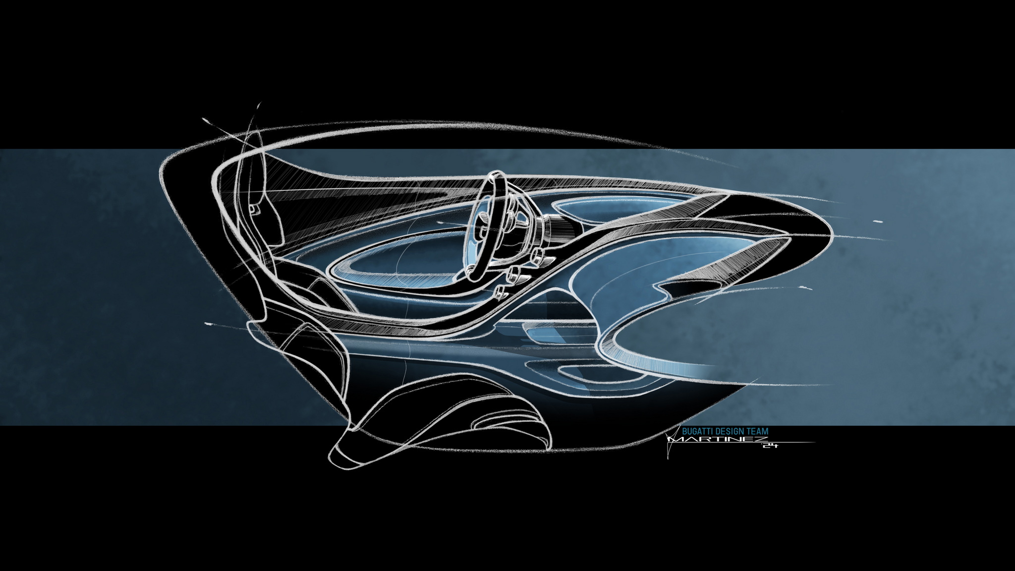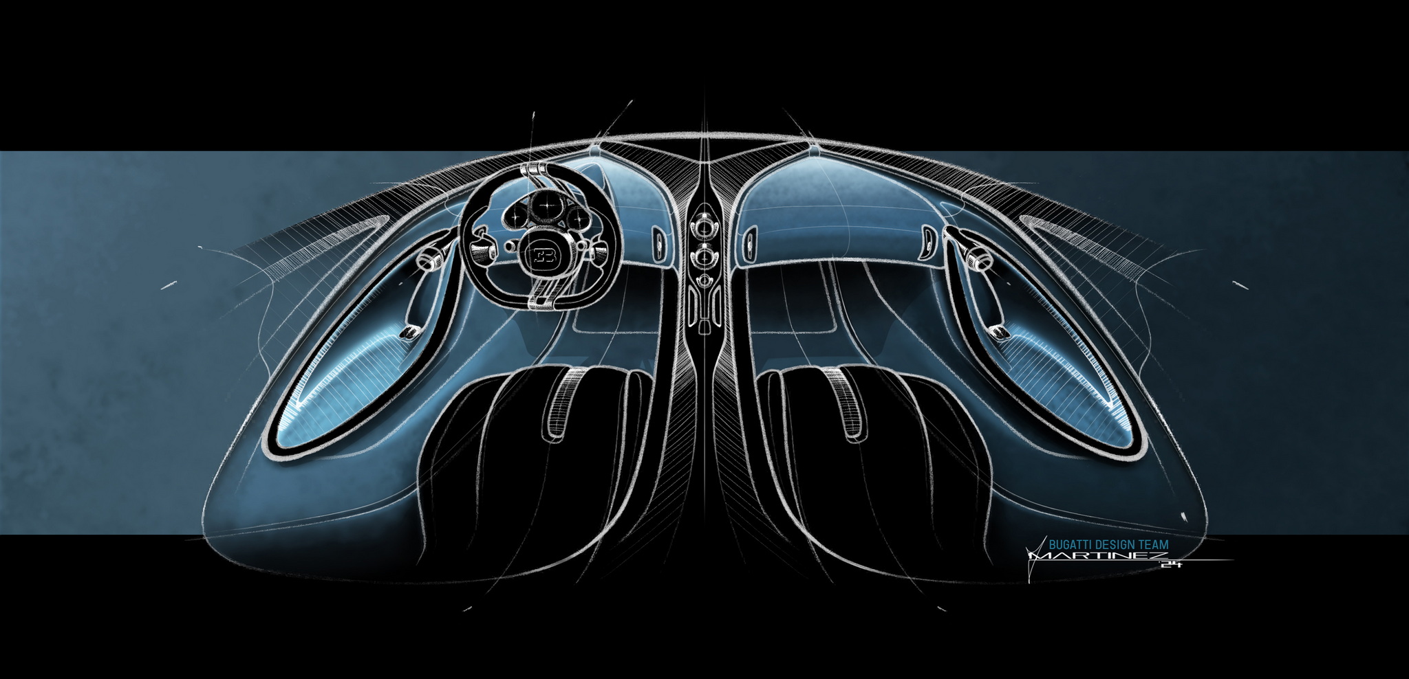 ห้องโดยสารแบบใหม่หมด เริ่มจากพวงมาลัยที่เรียกว่า Fixed hub steering wheel จะเห็นว่าส่วนที่เป็นโลโก้ EB และเกจ์มาตรวัดจะไม่หมุนตามวงพวงมาลัย ไม่ว่าจะเลี้ยวองศาไหนก็ยังสามารถเห็นข้อมูลบนเกจ์วัดได้ครบถ้วนไม่บดบัง ชุดเกจ์มาตรวัดแบบอนาล็อกได้แรงบัลดาลใจจากนาฬิกาเปลือยกลไกระดับหรู ใช้วัสดุไทเทเนียม กระจกแซฟไฟร์ และเม็ดทับทิมแท้ เราจะเห็นเฟืองกลไกเคลื่อนไหวอยู่เบื้องหลัง คอนโซลกลางเลือกใช้กระจกคริสตัลช่วยเผยให้เห็นกลไกเหล่าสวิตช์ต่างๆ ที่ทำจากอลูมิเนียม และยังมีซ่อนจอกลางสัมผัสซึ่งมันจะโผล่ขึ้นมาเพื่อแสดงข้อมูลตัวรถ การเชื่อมต่อมือถือ และใช้งานกล้องถอยหลัง เบาะนั่งเป็นแบบ semi fixed เพื่อลดน้ำหนักและให้ต่ำสุดเท่าที่เป็นไปได้ ปรับสูง-ต่ำได้ ปรับมุมเอนได้ แต่ไม่มีรางเลื่อนขยับหน้า-หลัง แต่นั่นไม่ใช่ปัญหาเพราะมีกล่องแป้นเหยียบสามารถปรับระดับหน้า-หลังด้วยไฟฟ้า