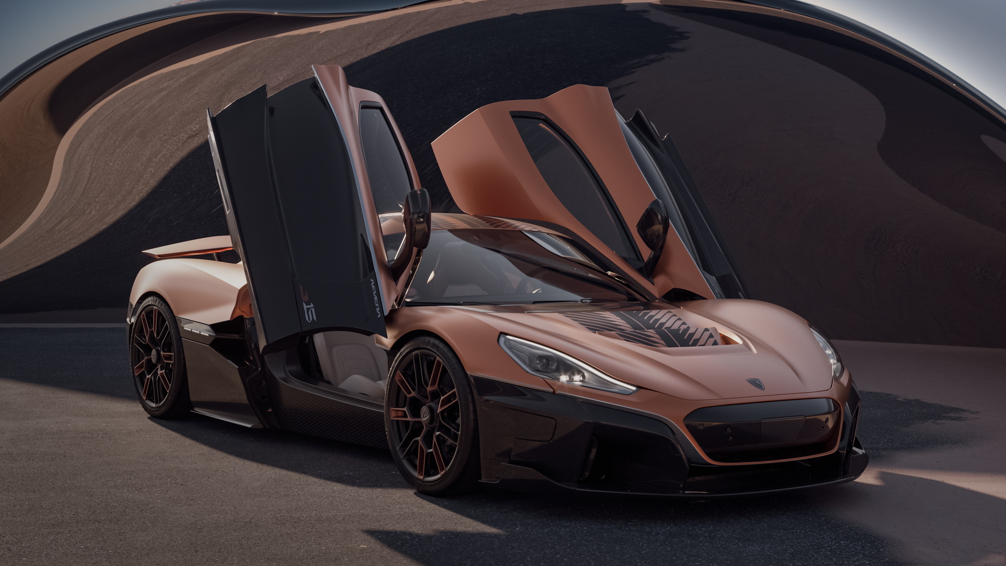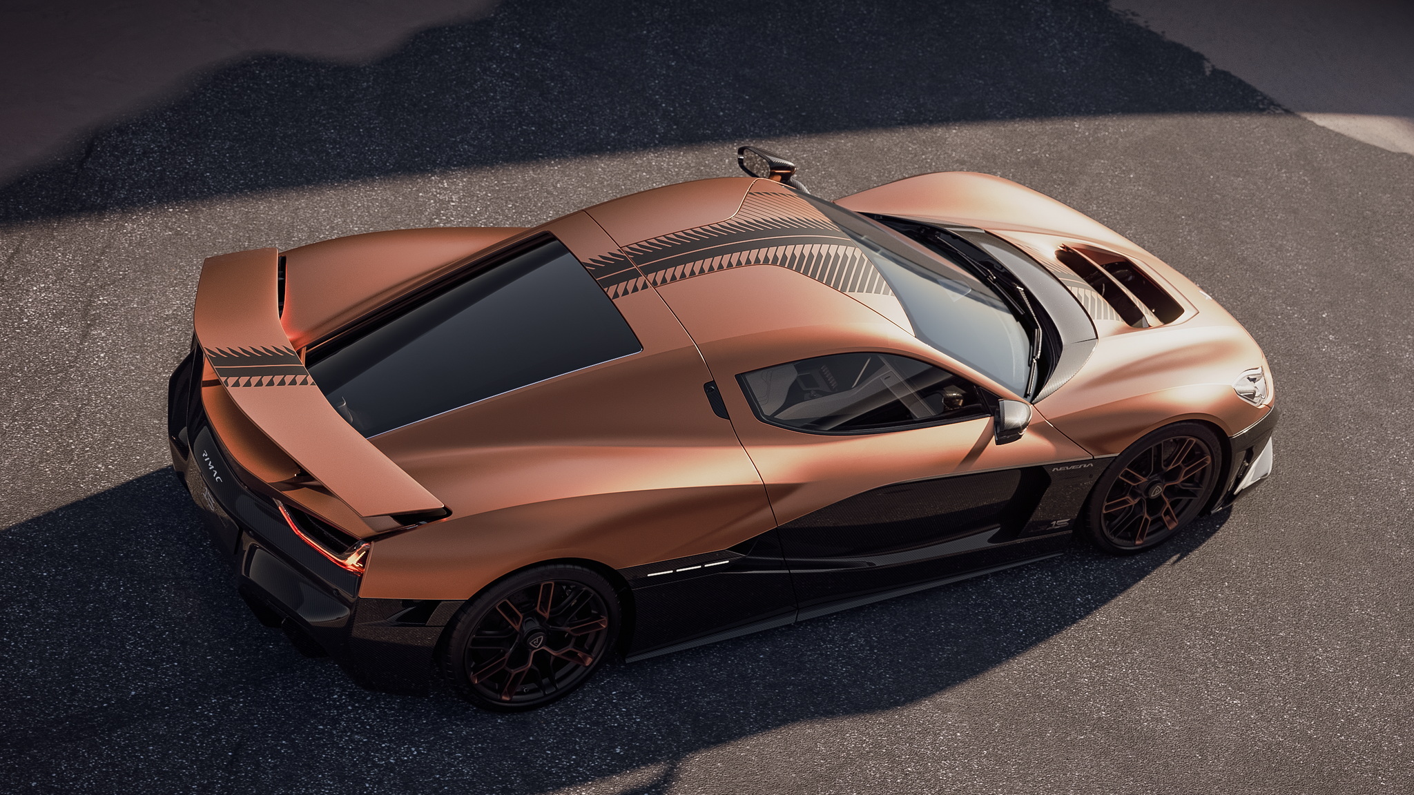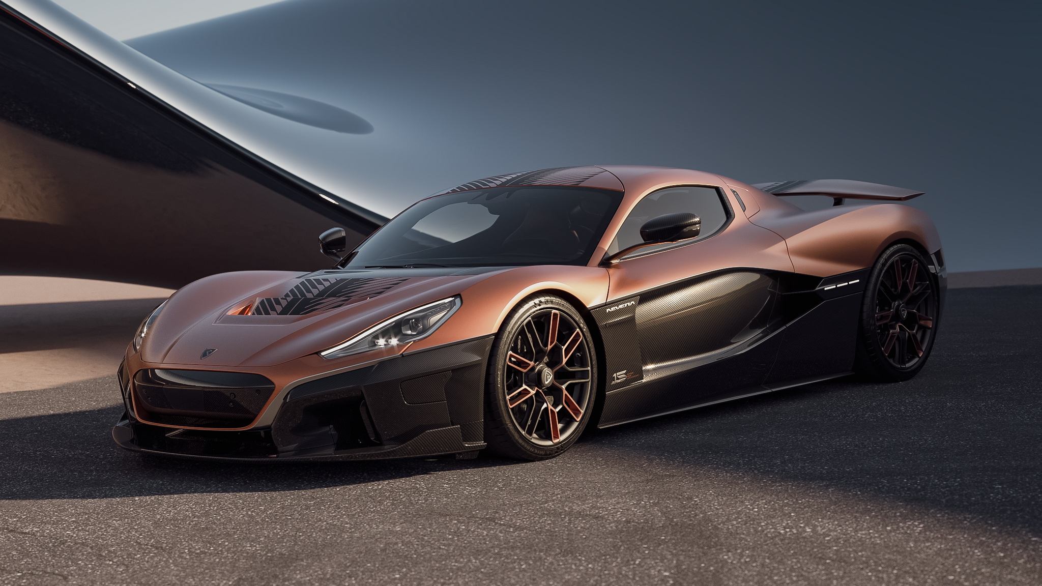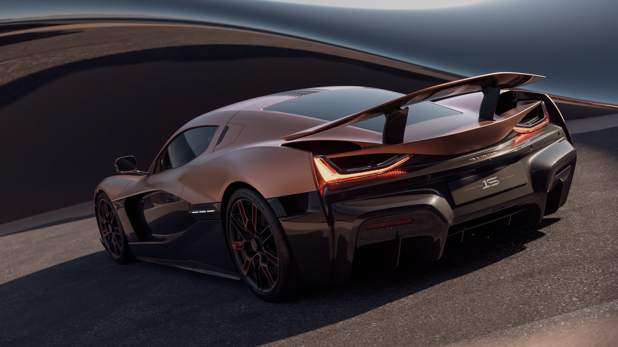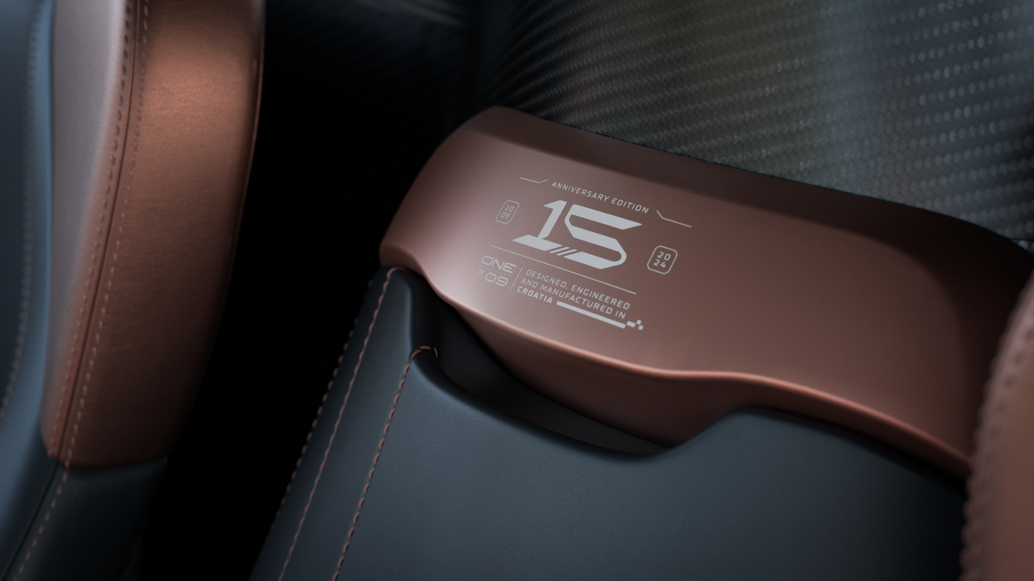 Rimac Nevera 15th Anniversary Edition มีทั้งหมด 9 คัน โดยคันที่เราเห็นในรูปนี้ถือเป็นคันแรก มาในตัวถังสีทองแดงแบบผิวด้านซึ่งถือเป็น Nevera คันแรกที่ใช้ผิวด้าน พร้อมกับลวดลายผาดกลางตัวรถเป็นเหมือนแผงวงจรไฟฟ้าเชื่อมต่อกัน ส่วนครึ่งล่างตัวรถจะเป็นคาร์บอนไฟเบอร์เปลือยเงาดุดัน ล้ออัลลอยด์เป็นสีทูโทนพิเศษ ตราสัญลักษณ์ครบรอบ 15 ปี ติดอยู่ข้างประตูทั้ง 2 บาน