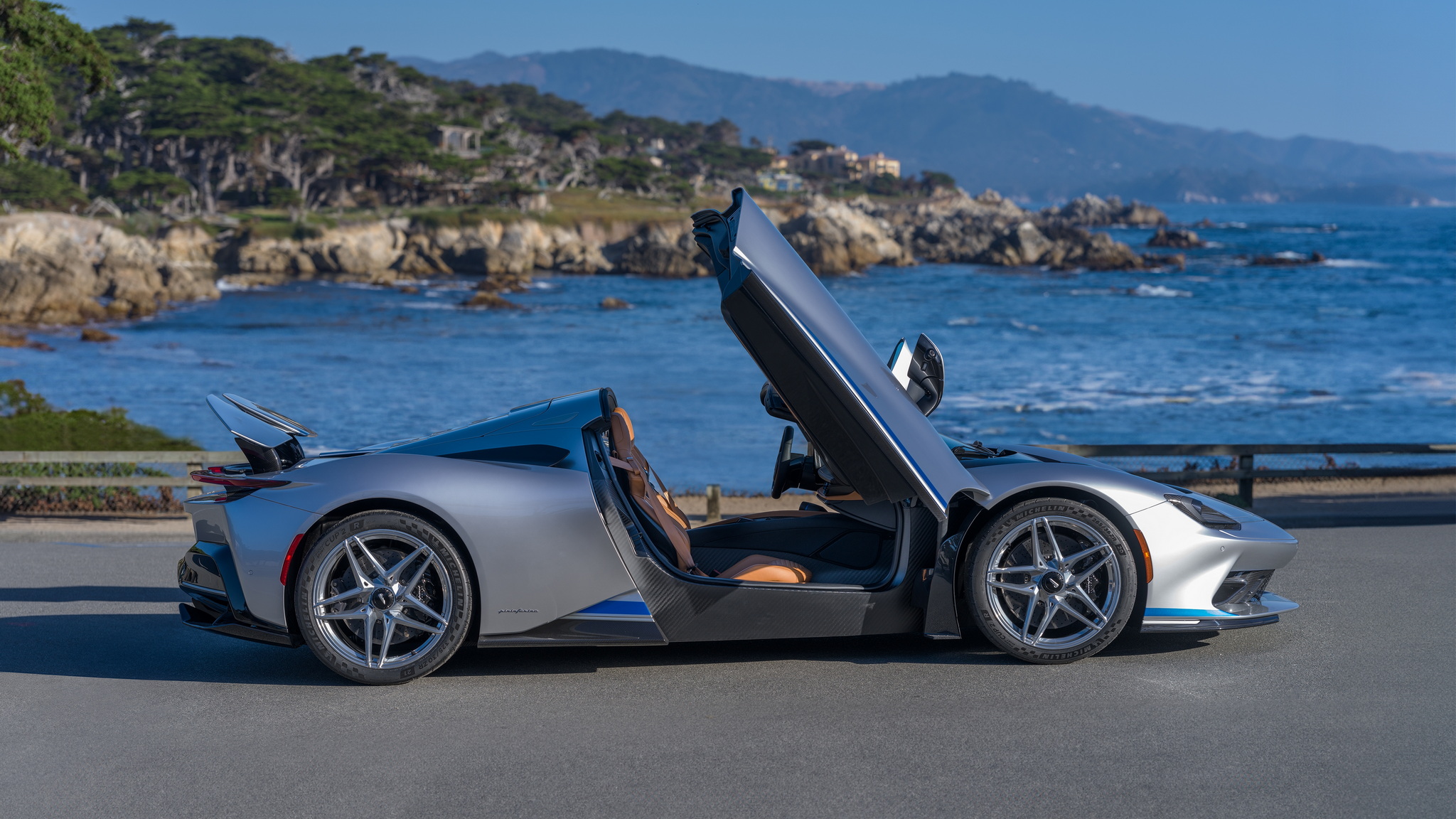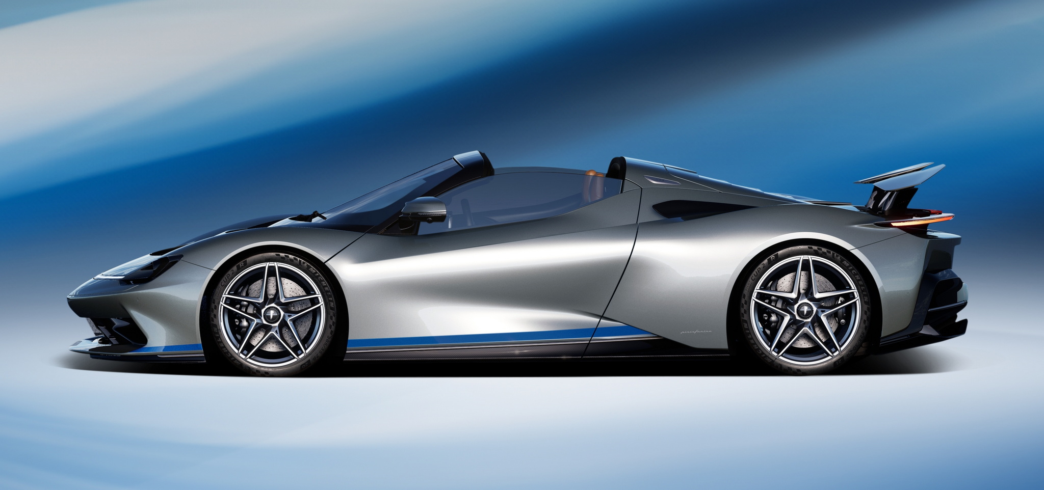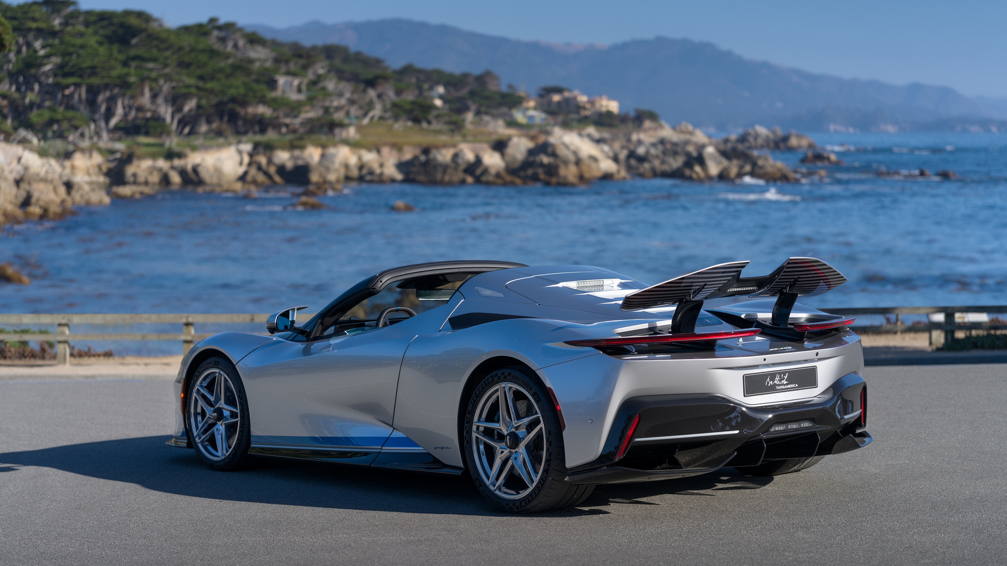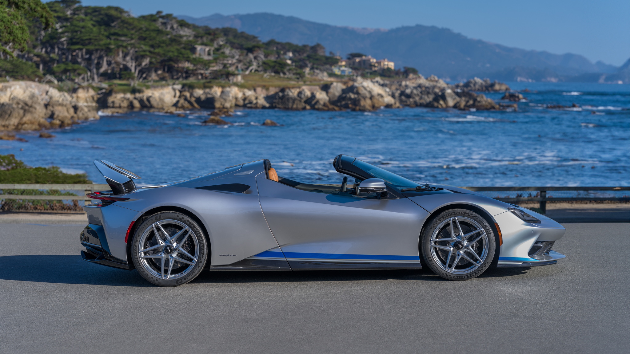 Battista Targamerica โดดเด่นด้วยความเป็นรุ่นเปิดประทุนทำพิเศษตามความต้องการลูกค้า แต่เดิม Battista จะมีกระจกบานหลังแต่ในคันนี้จะเปลี่ยนเป็นแบบทึบเซาะร่องไม่เหมือนใคร ตัวถังหลักมาในสีเงิน Argento Liquido Gloss พร้อมคาดเส้นส่วนล่างตัวถังด้วยสีน้ำเงิน Iconica Blu Gloss ใต้ปีกหลังแบบแอ๊คทีฟยังตกแต่งด้วยลายเส้น Pinstripes สีน้ำเงิน Iconica Blu เป็นงานวาดด้วยมือทั้งหมด ล้ออัลลอยด์ลาย 5 ก้าน เซรามิกขัดเงาสีเงินตัดกับดุมล้อ Center lock อลูมิเนียมอะโนไดซ์สีดำ