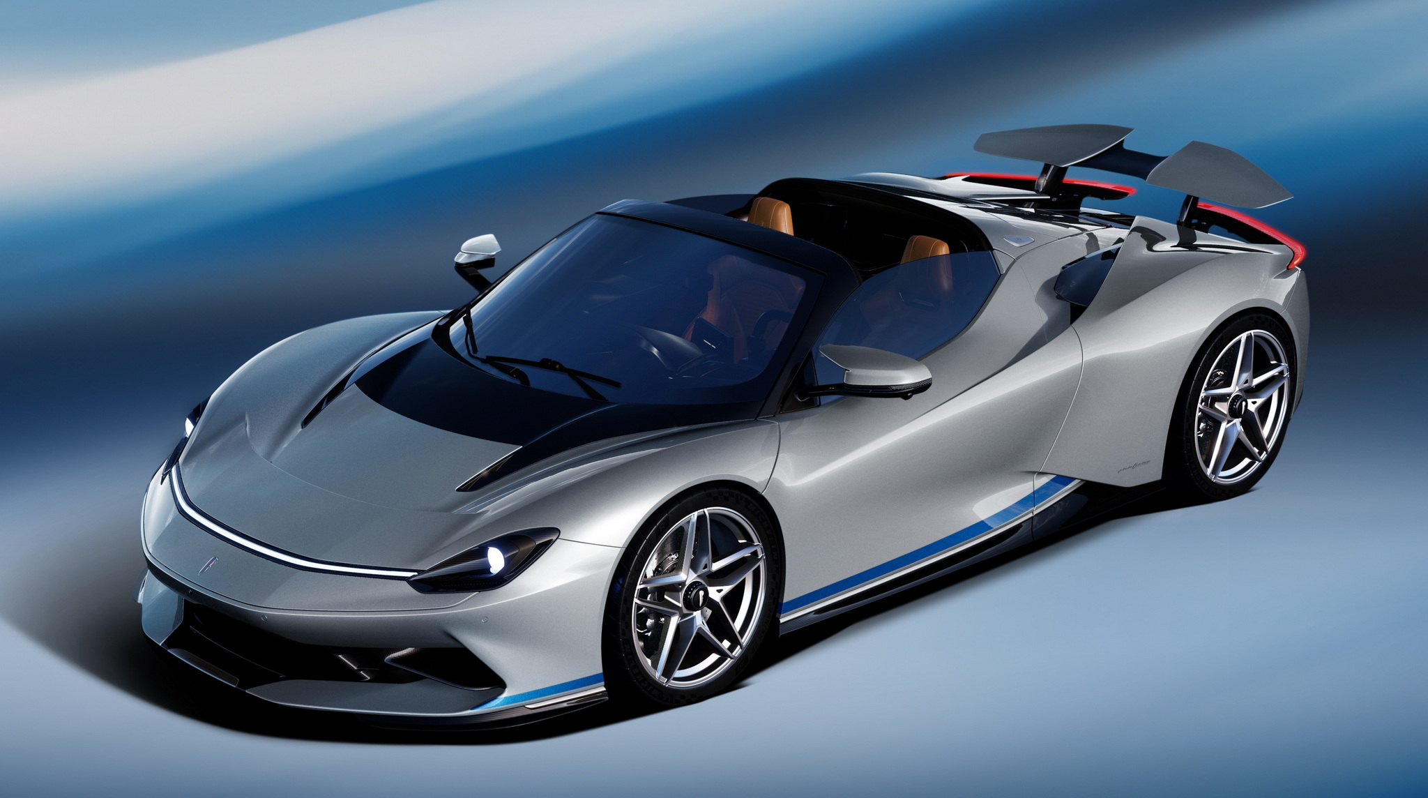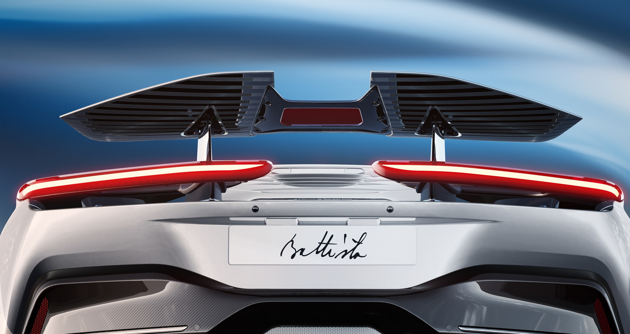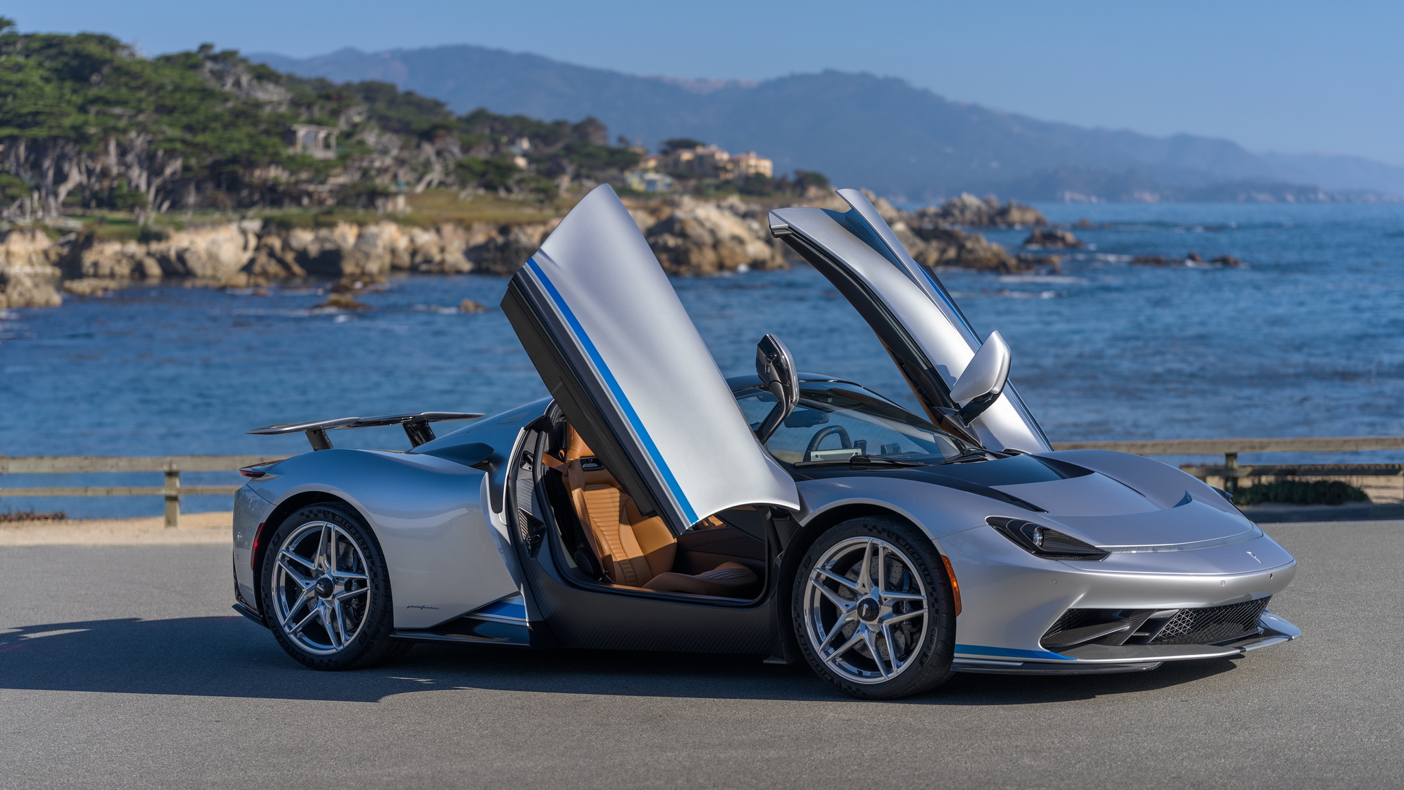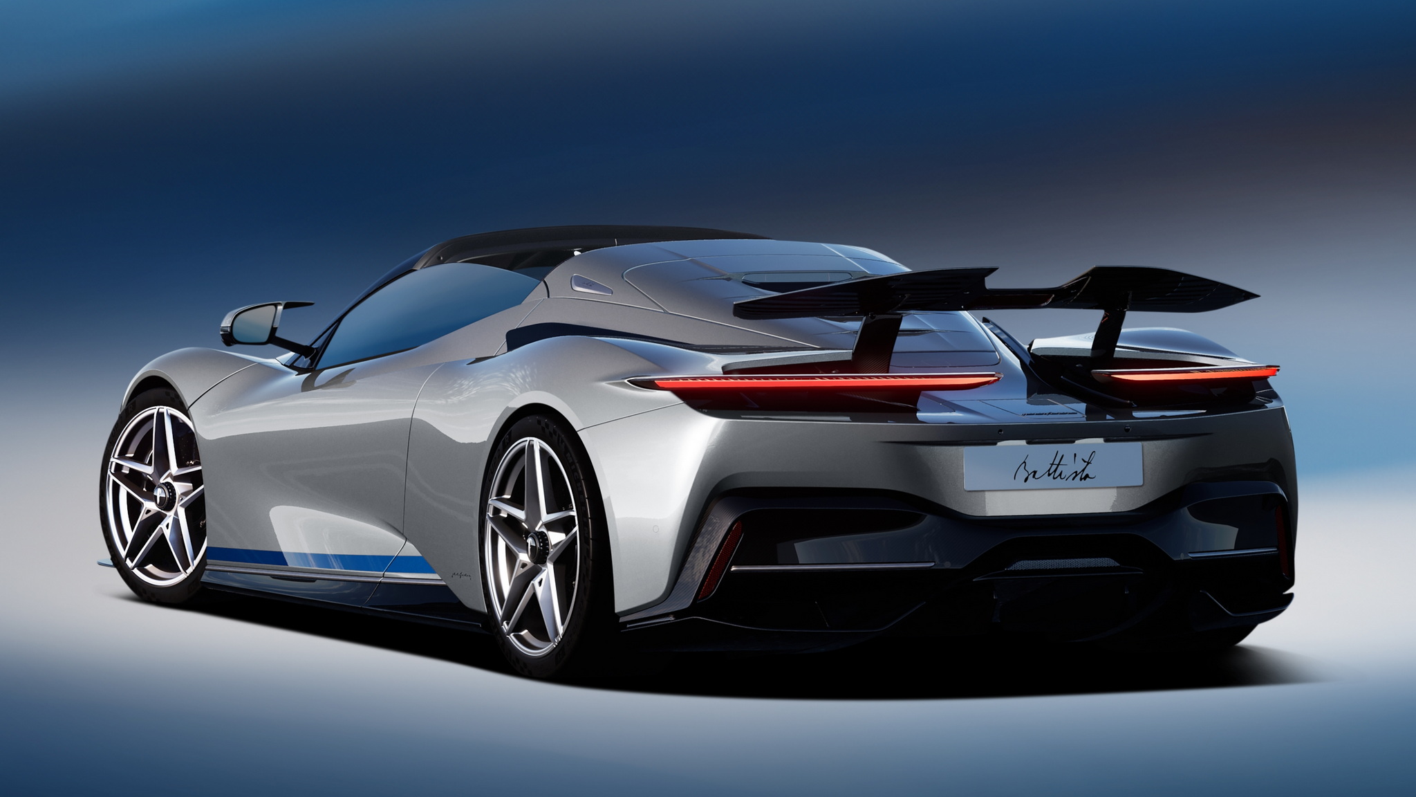 Battista Targamerica โดดเด่นด้วยความเป็นรุ่นเปิดประทุนทำพิเศษตามความต้องการลูกค้า แต่เดิม Battista จะมีกระจกบานหลังแต่ในคันนี้จะเปลี่ยนเป็นแบบทึบเซาะร่องไม่เหมือนใคร ตัวถังหลักมาในสีเงิน Argento Liquido Gloss พร้อมคาดเส้นส่วนล่างตัวถังด้วยสีน้ำเงิน Iconica Blu Gloss ใต้ปีกหลังแบบแอ๊คทีฟยังตกแต่งด้วยลายเส้น Pinstripes สีน้ำเงิน Iconica Blu เป็นงานวาดด้วยมือทั้งหมด ล้ออัลลอยด์ลาย 5 ก้าน เซรามิกขัดเงาสีเงินตัดกับดุมล้อ Center lock อลูมิเนียมอะโนไดซ์สีดำ