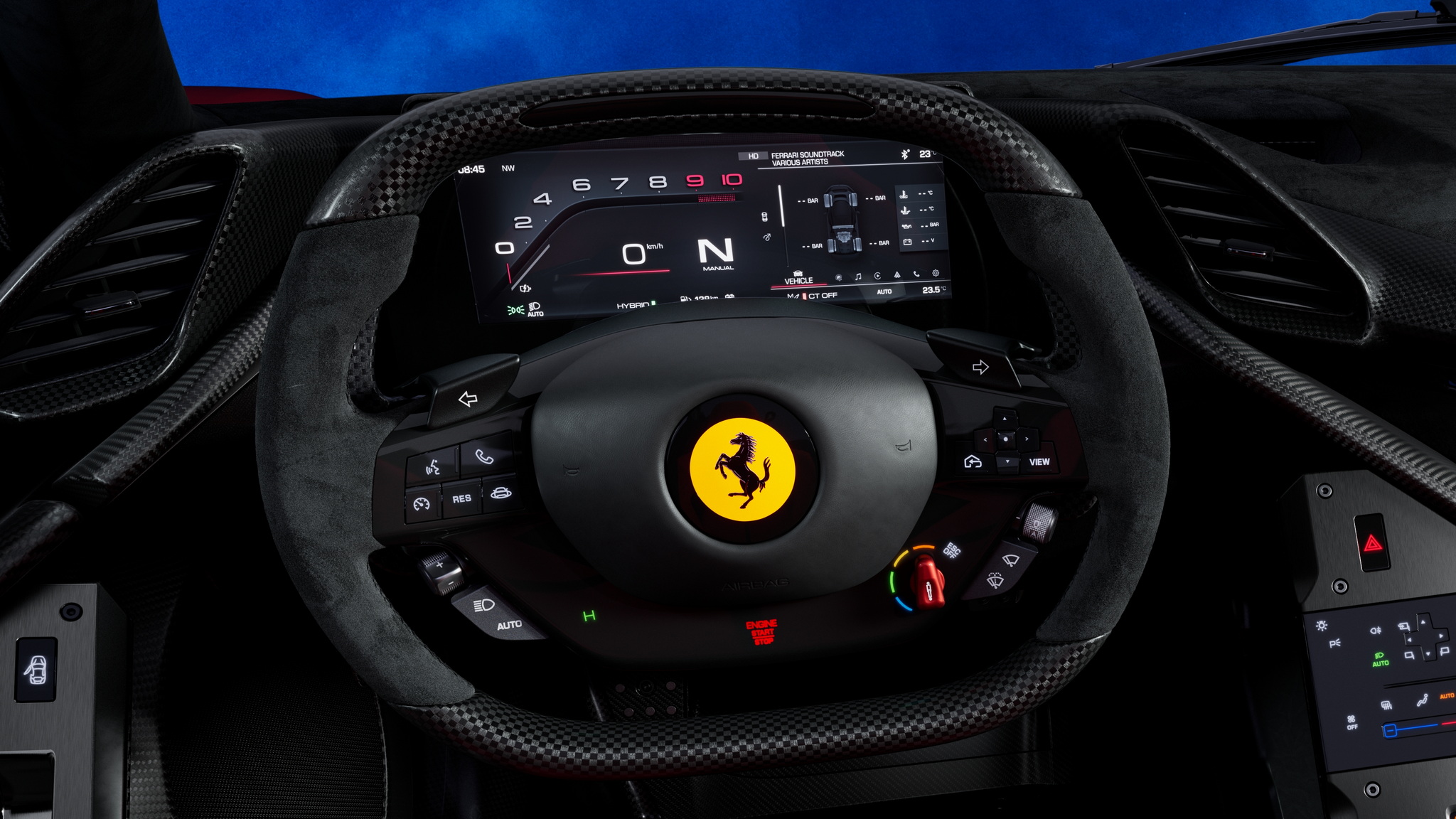 ห้องโดยสารให้อารมณ์สไตล์รถแข่งที่นั่งเดียว 1+ แต่จริงแล้วๆ มีที่นั่งฝั่งผู้โดยสารซึ่งทำให้สีกลืนดูล่องหน คอนโซลกลางเอียงเข้าหาผู้ขับเน้นปุ่มควบคุมเรียบง่าย พวงมาลัยออกแบบใหม่เฉพาะมีไฟเกียร์ Shift Light ลูกบิด Manettino ยังคงอยู่ และมี eManettino ซึ่งพบได้บนรถไฮบริดเฟอร์รารี่ทุกรุ่น ปกติรุ่นอื่นจะมี 4 โหมด แต่ F80 ตัดโหมด eDRIVE (วิ่งไฟฟ้าล้วน) ออกไปทำให้เหลือ 3 โหมด คือ Hybrid, Performance และ Qualify หน้าปัดแบบดิจิตอลทั้งหมด